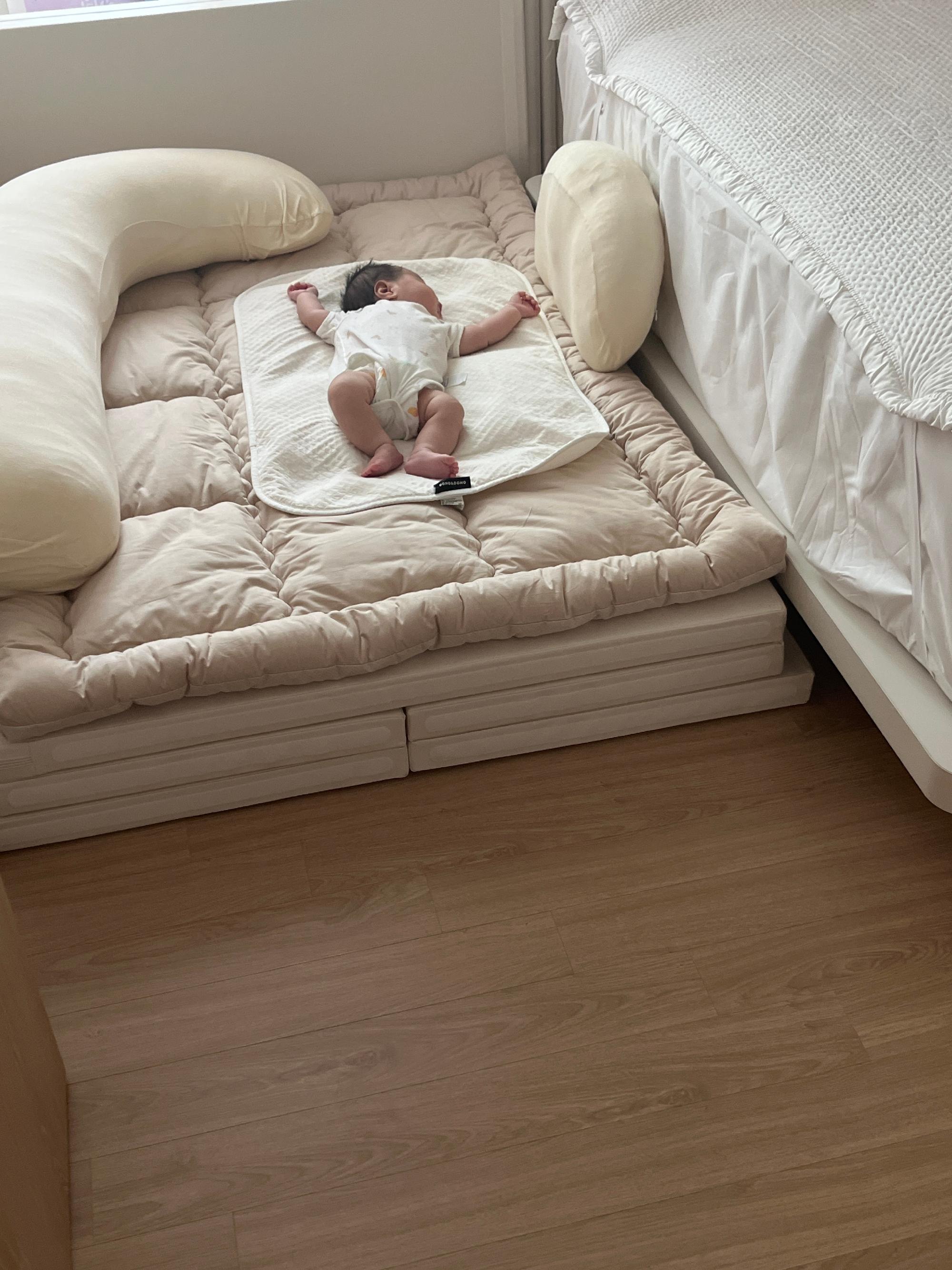 아직 리안 아기침대 쓰고 있어서 본격 하이가드 범퍼형으로 설치하지 않고 임시로 사진처럼 쓰고 있는데 애기가 잘 놀고 너무 편안해 합니다ㅎㅎ 대만족이에요